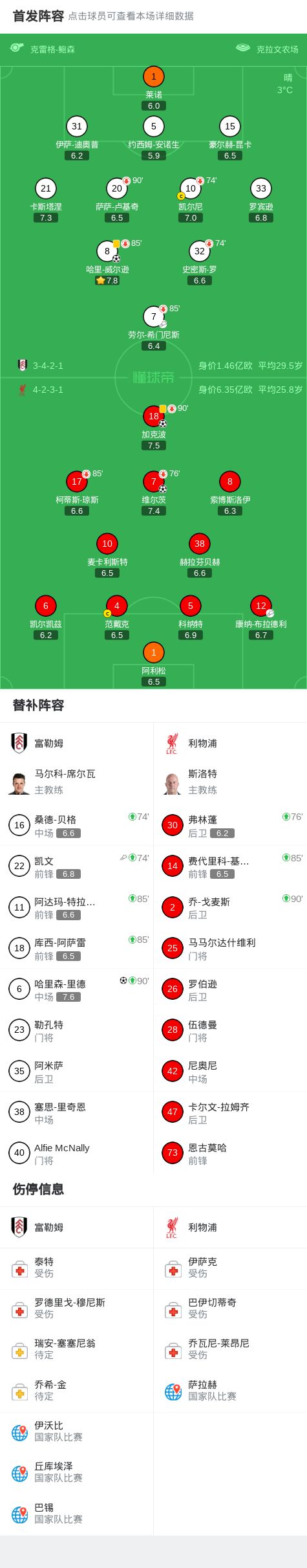 北京时间1月4日,英超联赛第20轮,富勒姆坐镇主场迎战利物浦。上半场,劳尔-希门尼斯助攻,哈里-威尔逊反越位破门先拔头筹;下半场,维尔茨疑似越位位置的进球经VAR认定有效,尾声阶段比赛进入高潮,加克波在禁区内推射破门反超比分,但哈里森-里德世界波破门迅速还以颜色。最终,利物浦客场2-2战平富勒姆。