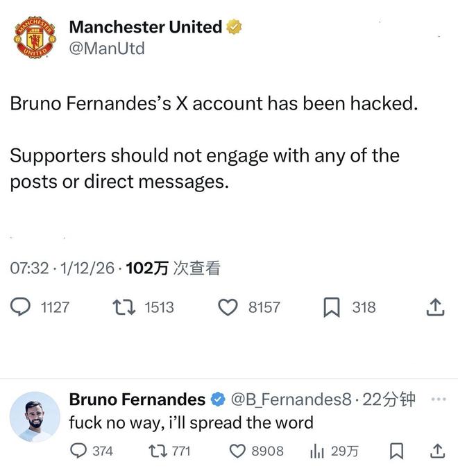 曼联社媒随后发布公告,表示:“布鲁诺-费尔南德斯的社媒账号遭到入侵。提醒球迷不要点击、回复或参与任何相关帖子及私信。”