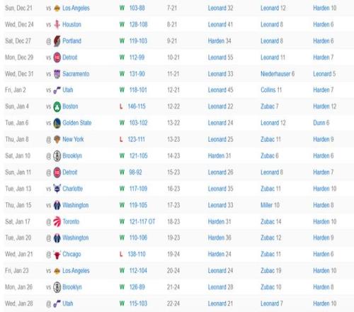 过去的19场比赛快船仅仅输给绿凯、尼克斯、公牛,期间快船击败了多支强队:湖人(2)、活塞(2)、猛龙、勇士、开拓者。
