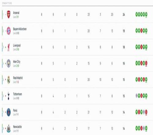 北京时间1月29日,欧冠联赛阶段最后一轮18场比赛全部结束了上半场的争夺。上半场结束后,曼城进入前八名,切尔西掉出前八名。西甲双雄皇马、巴萨目前都暂时落后,分别掉至第5和第13。