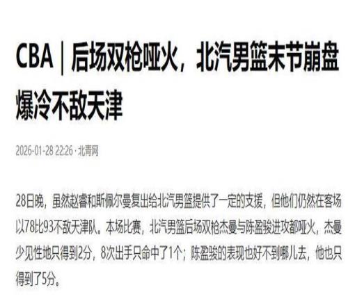 1月28日的京津德比中,拥有豪华阵容的北京队爆冷输给了天津队。