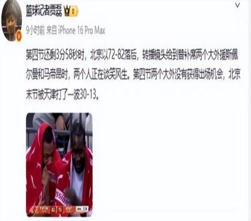 并配文北京队在落后的时候,北京队两大外援斯佩尔曼和马帝昂被拍到在谈笑风生。