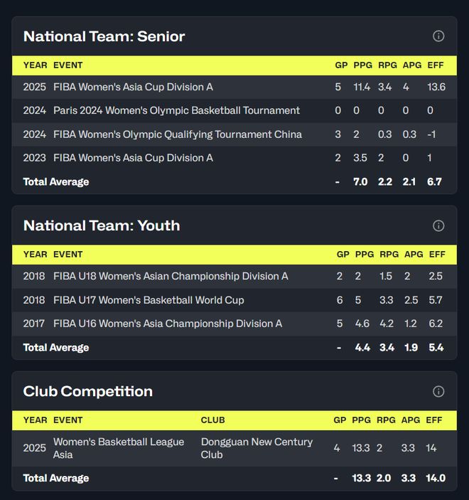 亚俱杯上杨舒予场均27.2分钟,拿到13.3分3.3助攻2篮板1.3抢断0.8盖帽,命中率53.8%,三分命中率29.4%。