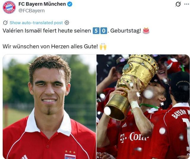直播吧9月28日讯 今天是前法国国脚瓦勒里安-伊斯梅尔50岁生日,拜仁官推也晒出其昔日身披球队战袍夺冠照片为其送上祝福。
