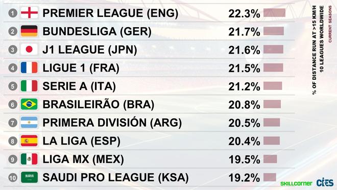 足球天文台(CIES Football Obs)统计了各联赛高速跑(速度>15km/h)距离占比,其中英超联赛22.3%排名第一,德甲21.7%排名第二,J1联赛21.6%排名第三,另外法甲21.5%排名第四,意甲21.2%排名第五。