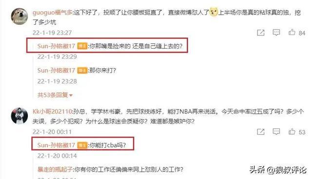 广厦球迷孙铭徽表现未能达到预期与球迷网络对线。
