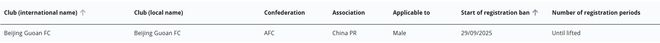 雷速体育10月3日讯 根据FIFA转会注册禁令公示系统显示,北京国安在9月29日新增一条转会注册禁令,期限为直至该禁令解除。