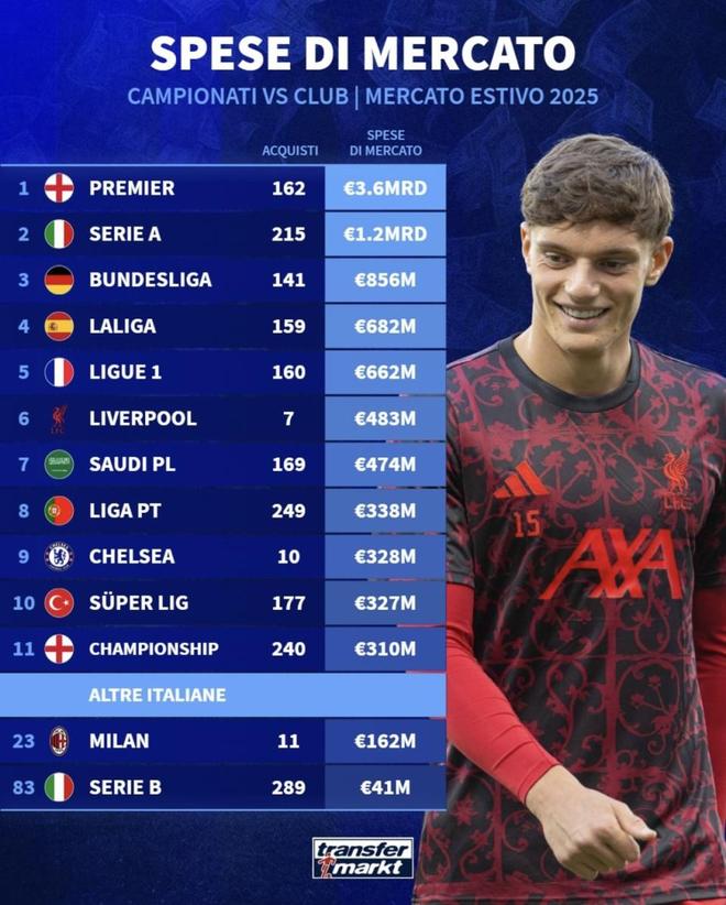 这个夏窗,钱从哪儿来、又花到哪儿去,一眼见分晓:英超继续当“现金黑洞”,净投入高达15亿欧元;法甲、德甲则在高强度出清资产,分别实现-3.38亿欧元与-1.44亿欧元的净结余(卖人盈余);意甲只用1亿欧元的净投入维持竞争,西甲更是“轻装上阵”,只花到了4500万欧元的净投入。数字背后,是不同联赛的生存逻辑与风险选择。(数据来自德国转会市场)