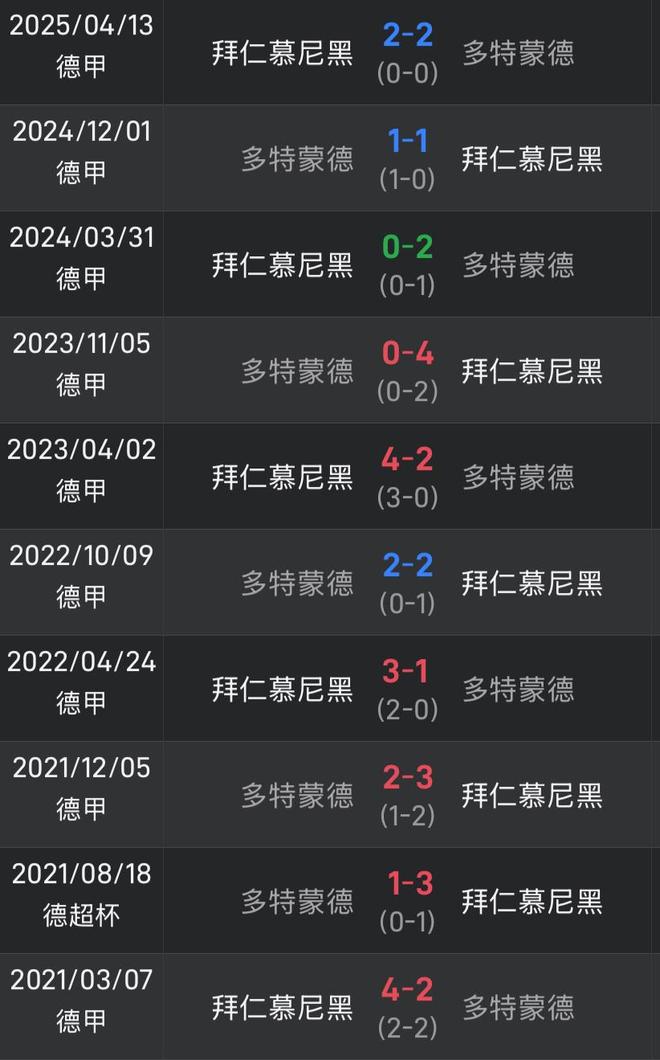 此外,双方近10次各项赛事交锋,拜仁占据上风,取得6胜3平1负的战绩。数据显示,自2021年3月以来,在双方的10次碰撞中,多特仅赢下1场。