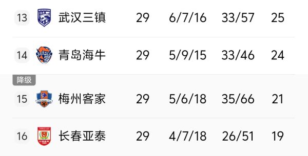 至此,青岛海牛的总积分提升到24分,领先身后的梅州客家(21分)3分,长春亚泰(19分)4分。在联赛还剩一轮情况下,亚泰提前降级。