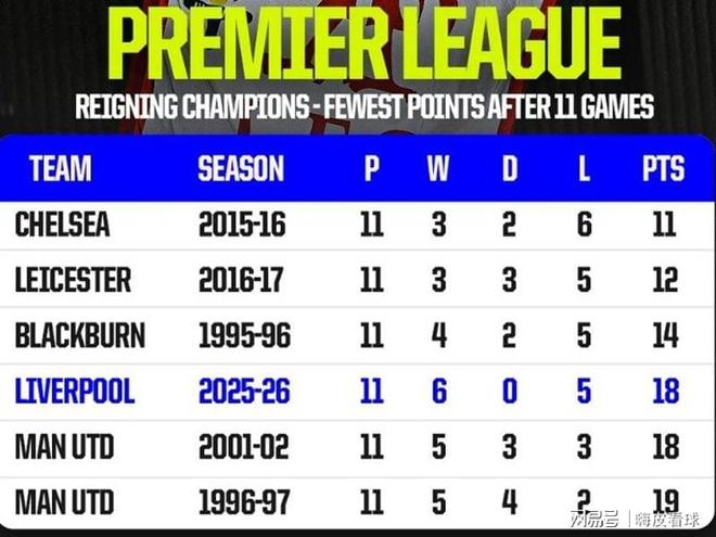 根据统计,作为卫冕冠军的利物浦,11轮拿到18分,并不是最差的冠军。曾经创造辉煌历史的曼联,在2001赛季中,11轮比赛同样只有18分,最终获得77个积分,排在第三名,是弗格森爵士带队,在英超的最低排名。经历了英超三连冠,以及99年的三冠王之后,曼联陷入一段5年仅1冠的“低迷”期,直到鲁尼和C罗加盟后才重新崛起。