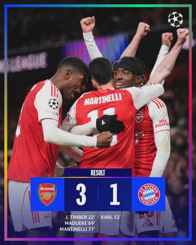 更令对手胆寒的是阿森纳的替补席深度。当拜仁只能依靠奥利塞单兵突击时,阿森纳换上的马杜埃凯、马丁内利、卡拉菲奥里、厄德高组成"超级替补团",直接主导了后两个进球。正如球迷感叹:"看看人家换上来的都是什么牌?拜仁今天根本没好牌可打。"