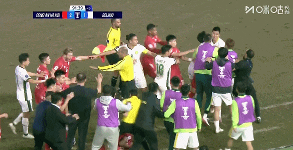 易边再战,第50分钟国安后防注意力不集中,河内公安前场界外球快发,阮庭北突入禁区后传中造险,江文豪抢先一步解围的同时被对手铲倒。