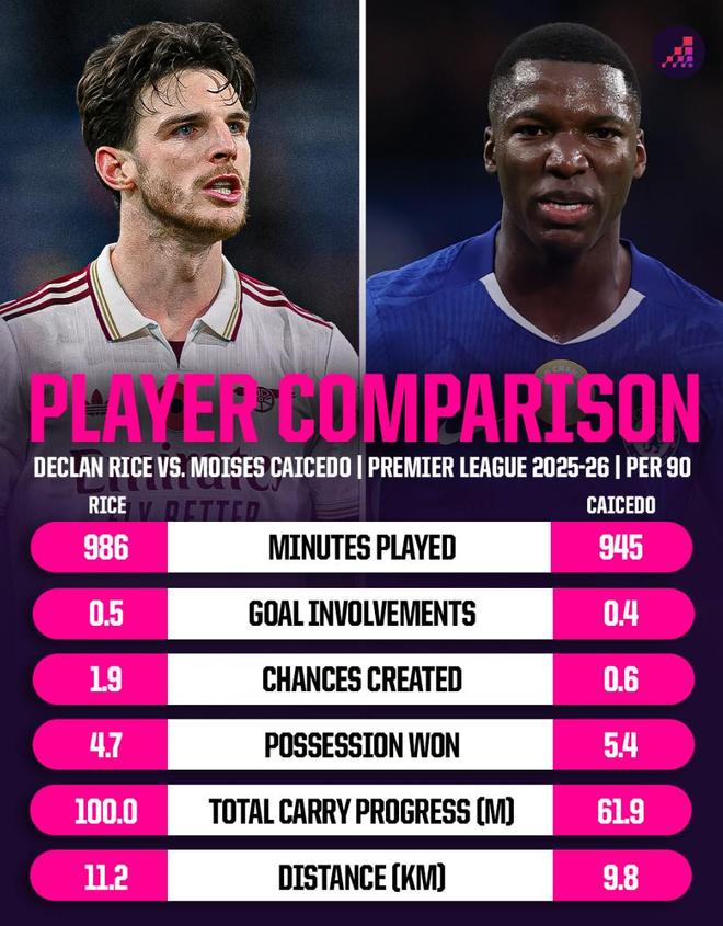 北京时间12月1日凌晨,英超第13轮比赛焦点战,切尔西将在主场迎战领头羊阿森纳,赛前,足球数据网站Opta对比了赖斯、凯塞多本赛季英超的数据。